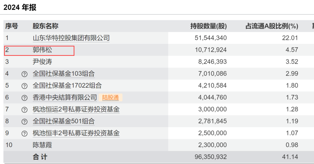 早在2024年一季报,郭伟松就已经现身华特达因前十大流通股股东名单,并于2024年年末成为第二大股东。